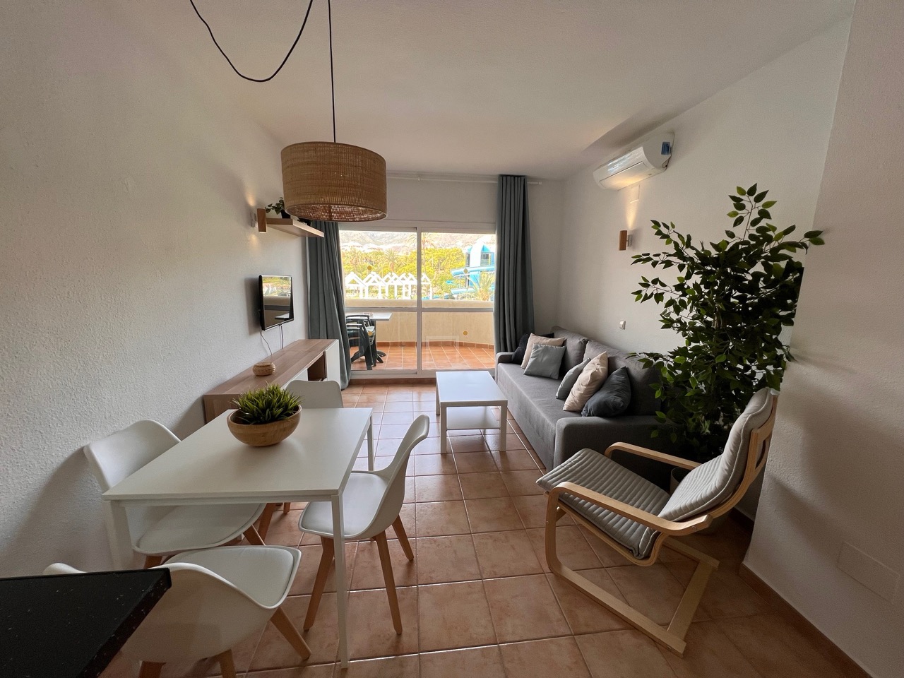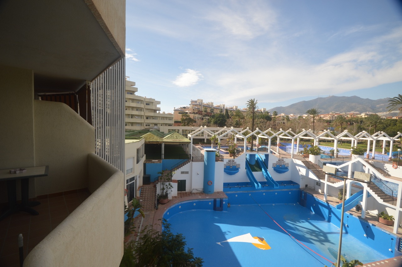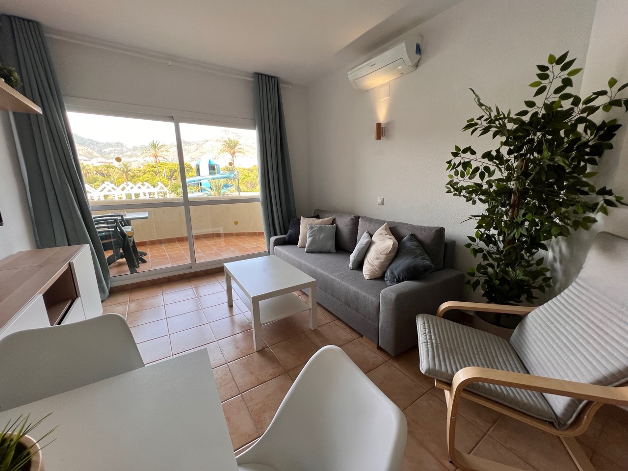 A lovely fourth floor one bedroom apartment, located in the grand Benal Beach complex! With an open-style and fully equipped kitchen with spacious lounge area/dinning area, fully refurbished bathroom and terrace overlooking the wonderful pool and garden area, you’ll be sure to enjoy your stay here! It has a pleasant terrace with views facing towards the community gardens and pools. Fantastic holiday home that is fully equipped for holiday rentals. Complex is located just a mere 100 meters from the beach and close to many diverse services: like bars, restaurants and supermarkets. It is well comunicated with public transport and taxi services. Complex offers 5 big swimming pools with slides, 24 hour reception  relaxing garden areas and also gym area (required membership).